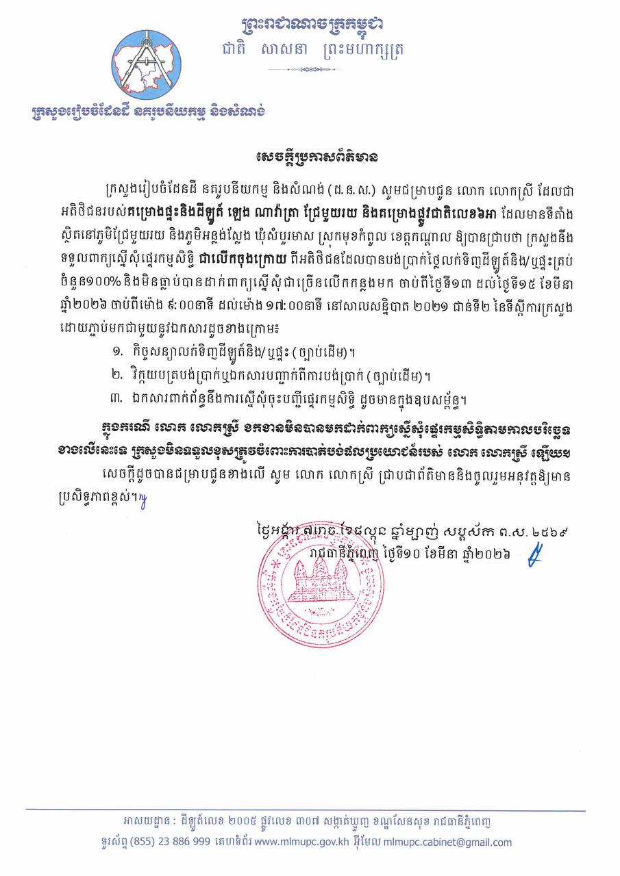 ក្រសួងនឹងទទួលពាក្យស្នើសុំផ្ទេរកម្មសិទ្ធិ ជាលើកចុងក្រោយ ពីអតិថិជនដែលបានបង់ប្រាក់ថ្លៃលក់ទិញដីឡូត៍និង/ឬផ្ទះគ្រប់ចំនួន ១០០% និងមិនធ្លាប់បានដាក់ពាក្យស្នើសុំជាច្រើនលើកកន្លងមក ចាប់ពីថ្ងៃទី១៣ ដល់ថ្ងៃទី១៥ ខែមីនា ឆ្នាំ២០២៦ ចាប់ពីម៉ោង ៩:០០នាទី ដល់ម៉ោង ១៧:០០នាទី នៅសាលសន្និបាត២០២១ ជាន់ទី២ នៃទីស្ដីការក្រសួងរៀបចំដែនដី នគរូបនីយកម្ម និងសំណង់ ដោយភ្ជាប់មកជាមួយនូវឯកសារដូចខាងក្រោម ៖